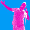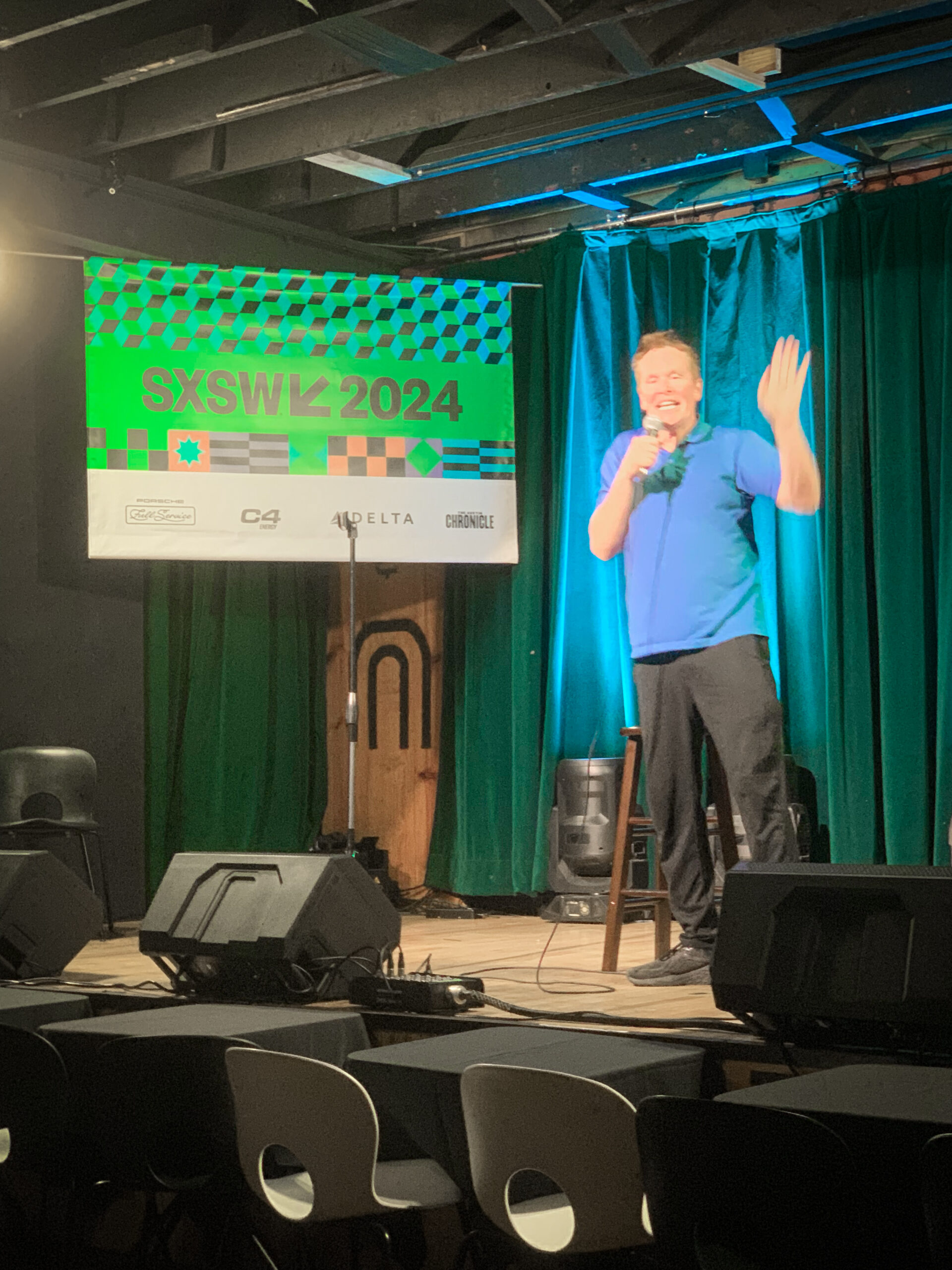 His signature black-and-white tee says it all: “Audiences are my favorite people.”